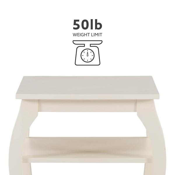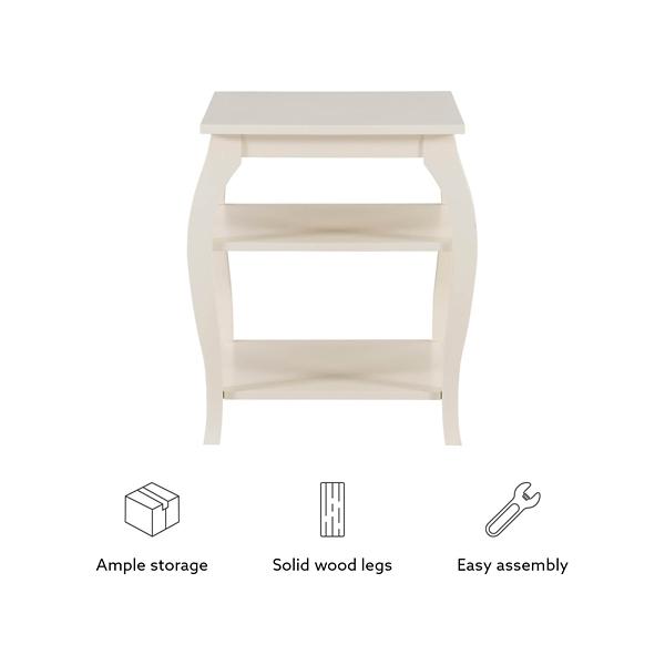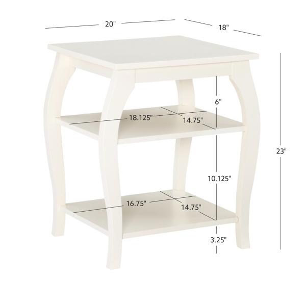 Update your space with the unique, modern design of this White Prismatic Wood Accent Table. With its sleek black finish and multiple shelves, it’s a beautiful way to add storage to your living room or bedroom! Table measures 20L x 18W x 23H in. Crafted of solid wood and wood composite Painted off-white finish Features two (2) lower shelves Curved leg design Weight capacity: 20 lbs. per shelf Assembly required; see Info & Guides below to view or print assembly instructions Not intended for commercial use Care: Dust with a soft, dry cloth. This item is available at Kirklands.com only, not available in stores. Please note: this item cannot be shipped to APO/FPO addresses. WARNING: This product can expose you to chemicals including DEHP, which are known to the state of California to cause cancer and birth defects or other reproductive harm. For more information go to www.P65Warnings.ca.gov.