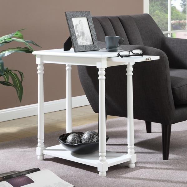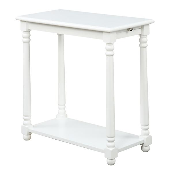 With a sturdy construction and a classically simple design, this White Regent Wood Accent Table will be the perfect addition to your space. Its pull-out shelf offers convenient, extra surface space whenever needed! Table measures 11.75L x 23.5W x 24H in. Crafted of wood composite White finish Features one (1) pull-out shelf and one (1) lower shelf Weight: 17 lbs. Shelf weight capacity: 20 lbs. Assembly required Not intended for commercial use Care: Dust with a soft, dry cloth. This item is available at Kirklands.com only, not available in stores. Please note: this item cannot be shipped to APO/FPO addresses.