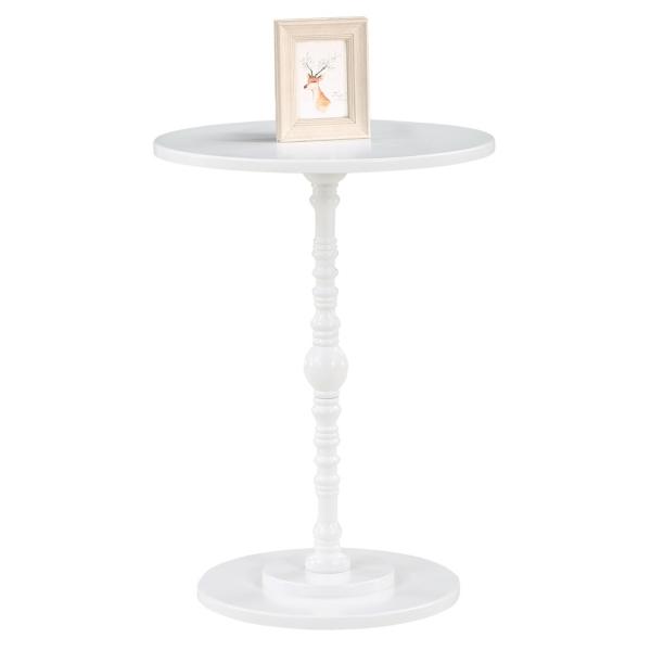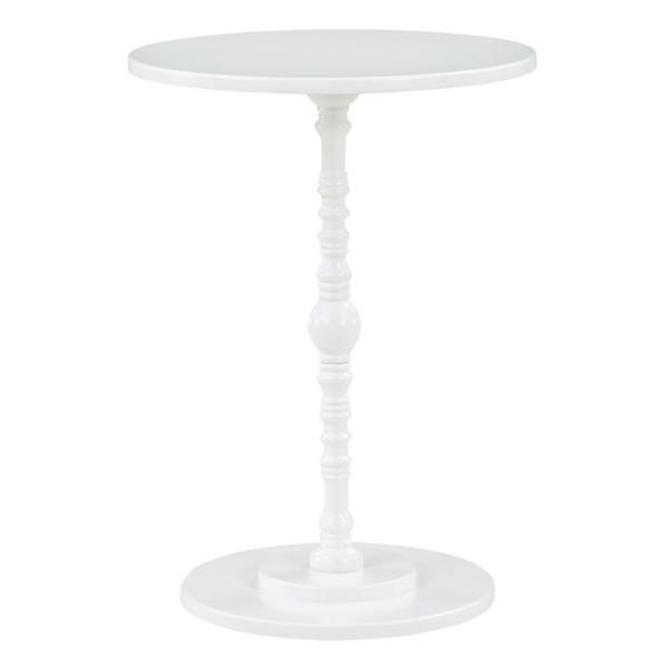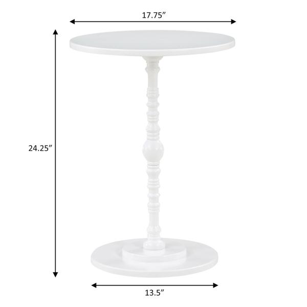 Featuring a beautifully sculpted spindle base, this White Santel Spindle Accent Table will bring a timeless sophistication to your space that complements both traditional and modern decor! Its sturdy and stylish construction is perfect for placing beside your sofa or bed. Table measures 24.25H x 17.75 in. in diameter Crafted of solid wood and wood composite Painted white finish Round shape Turned spindle base Weight: 12 lbs. Weight capacity: 20 lbs. Assembly required Not intended for commercial use Care: Dust with a soft, dry cloth. This item is available at Kirklands.com only, not available in stores. Please note: this item cannot be shipped to APO/FPO addresses.
