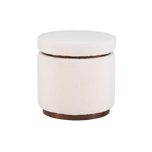 Whether it sits next to your sofa or vanity, the White Sherpa Upholstered Storage Ottoman will create a cozy vibe! Tuck away throws, books, and more in its hidden storage space! Ottoman measures 18L x 18W x 18H in. Crafted of pine wood and wood composite Walnut wood trim finish Upholstered in a white sherpa polyester fabric with sponge fill Removable lid lifts to reveal storage space Round shape Weight capacity: 225 lbs. No assembly required Not intended for commercial use Made in Vietnam Care: Spot clean only. This item is available at Kirklands.com only, not available in stores. Please note: this item cannot be shipped to APO/FPO addresses. WARNING: This product can expose you to chemicals including DEHP which is known to the state of California to cause cancer and birth defects or other reproductive harm. For more information go to www.P65Warnings.ca.gov.