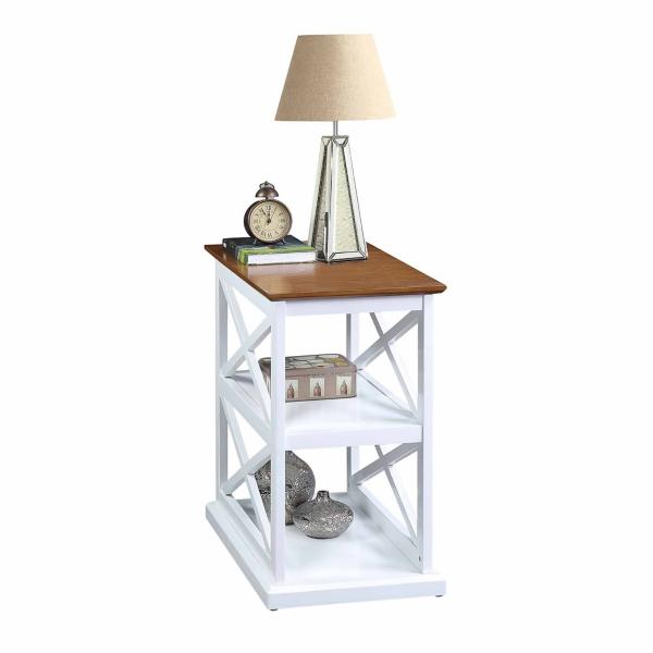 Upgrade your living room with this White Two-Tone Wood Double X Sides Accent Table! With an eye-catching design and plenty of storage space, you'll love styling this table to complement your space. Accent table measures 14W x 24D x 25H in. Crafted of solid wood Light brown wood tabletop finish White base finish Features three (3) tiers of shelving Double X design Beveled edges Weight: 28 lbs. Weight capacity: 60 lbs. Assembly required Not intended for commercial use Care: Wipe with a soft, dry cloth. This item is available at Kirklands.com only, not available in stores. Please note: this item cannot be shipped to APO/FPO addresses.
