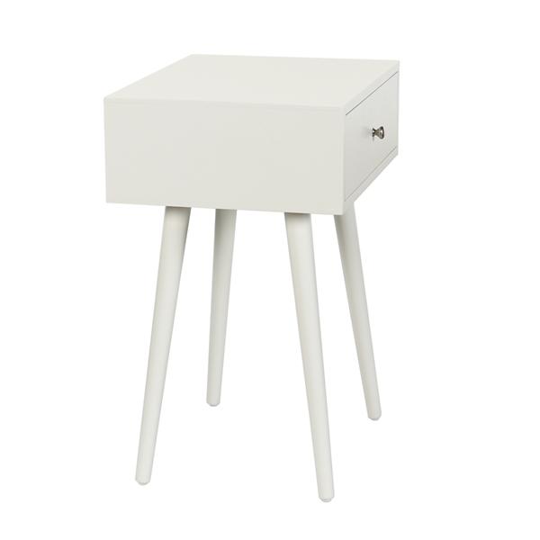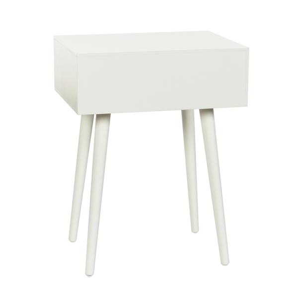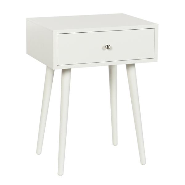 Elevate your living room with this White Wood 1-Drawer Arthur Accent Table! Its minimalist design and mid-century modern style makes it perfect for accenting your space and adding a bit of storage! Accent table measures 17.75W x 13.75D x 23.5H in. Crafted of manufactured wood White finish Features one (1) drawer with a silver pull Tapered angled legs Weight: 16.5 lbs. Assembly required Not intended for commercial use Care: Wipe with a soft, dry cloth. This item is available at Kirklands.com only, not available in stores. Please note: this item cannot be shipped to APO/FPO addresses.
