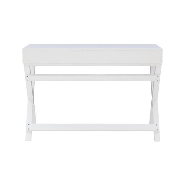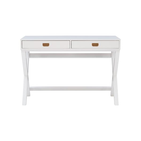 The White Wood 2-Drawer X-Frame Desk will make your workspace an organized yet welcoming place to be. Accented with rose gold drawer pulls, it’s sure to make a chic statement! Desk measures 44L x 20W x 30H in. Crafted of pine wood and wood composite White finish Features two (2) drawers Accented with rose gold drawer pulls X-shaped frame Weight capacity: 100 lbs. Assembly required; see Info & Guides below to view or print assembly instructions. Not intended for commercial use Care: Dust with a soft, dry cloth. This item is available at Kirklands.com only, not available in stores. Please note: this item cannot be shipped to APO/FPO addresses. WARNING: This product can expose you to chemicals including DEHP which is known to the state of California to cause cancer and birth defects or other reproductive harm. For more information go to www.P65Warnings.ca.gov.