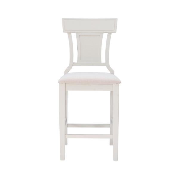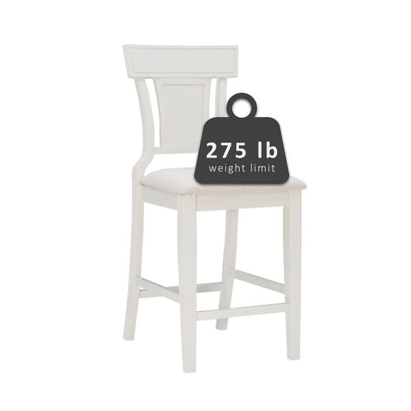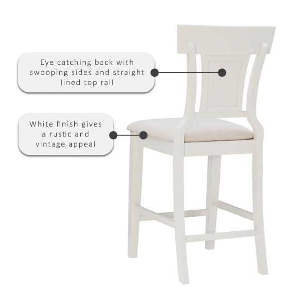 Elevate your farmhouse decor with our White Wood and Rattan Upholstered Counter Stool. Its swooping backrest design and footrest are sure to keep you comfortable. You will love how its woven rattan center looks in your space! Stool measures 21.75L x 19W x 43H in.; seat measures 26H in. Crafted of wood and rattan White finish Seat upholstered in beige polyester fabric Backrest features a handwoven rattan center Accented with swooping sides and a footrest Suitable for counter heights of 35 in. to 39 in. Weight: 19.9 lbs. Weight capacity: 275 lbs. Assembly required Not intended for commercial use Care: Dust with a soft, dry cloth. Spot clean fabric. This item is available at Kirklands.com only, not available in stores. Please note: this item cannot be shipped to APO/FPO addresses. WARNING: This product can expose you to chemicals including Di-(2-ethl hexyl) phthalate which is known to the state of California to cause cancer and birth defects or other reproductive harm. For more information go to www.P65Warnings.ca.gov.