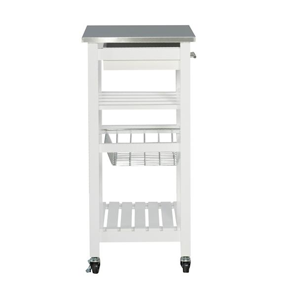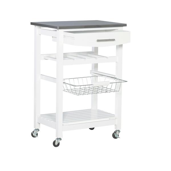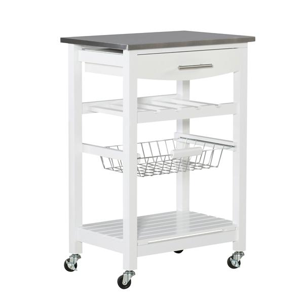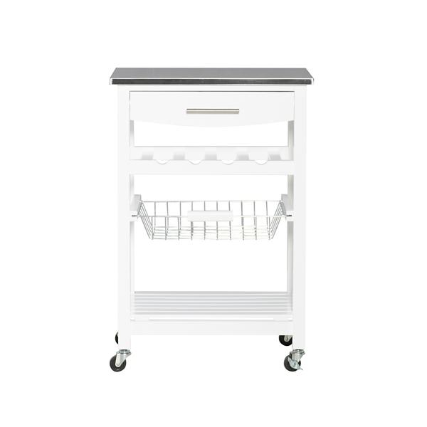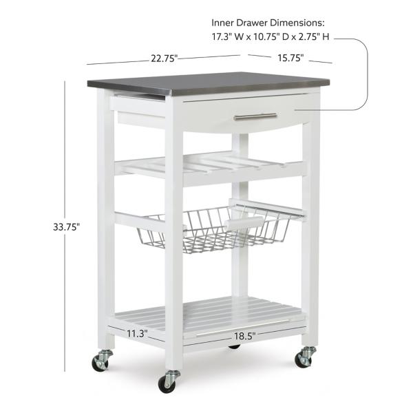 This White Wood and Stainless Steel Kitchen Cart easily creates extra storage and counter space in your kitchen. Its steel top is ideal for prepping meals, while its drawer and shelves will keep your utensils and other cooking needs readily available! Cart measures 22.8L x 15.8W x 33.8H in. Crafted of pine wood and stainless steel White finish Food safe, stainless steel top Features a drawer, wine rack, metal wire basket, and bottom shelf Wine rack holds four (4) bottles Features four (4) locking caster wheels Weight capacity: 150 lbs. Assembly required; see Info & Guides below to view or print assembly instructions. Not intended for commercial use Care: Dust with a soft, dry cloth. This item is available at Kirklands.com only, not available in stores. Please note: this item cannot be shipped to APO/FPO addresses. WARNING: Cancer and Reproductive Harm - For more information go to www.P65Warnings.ca.gov.