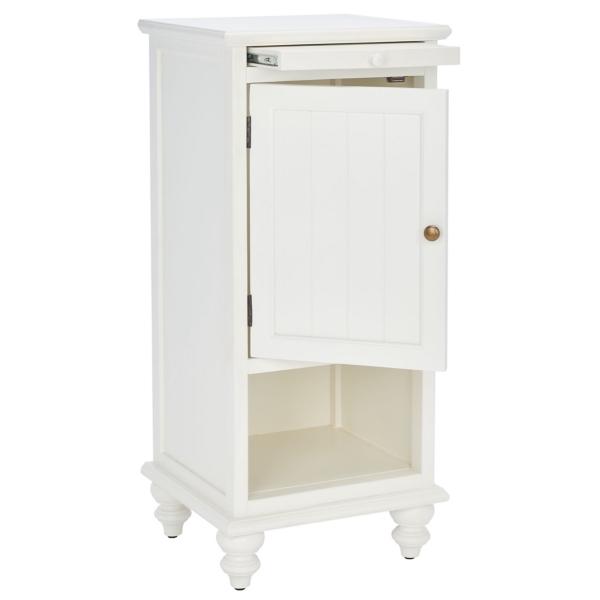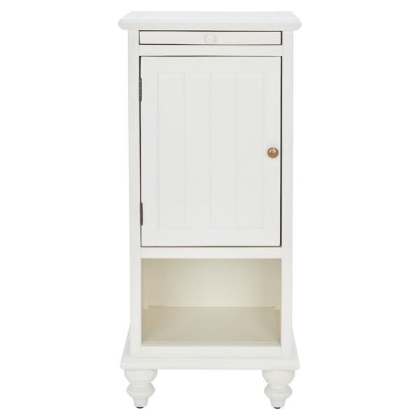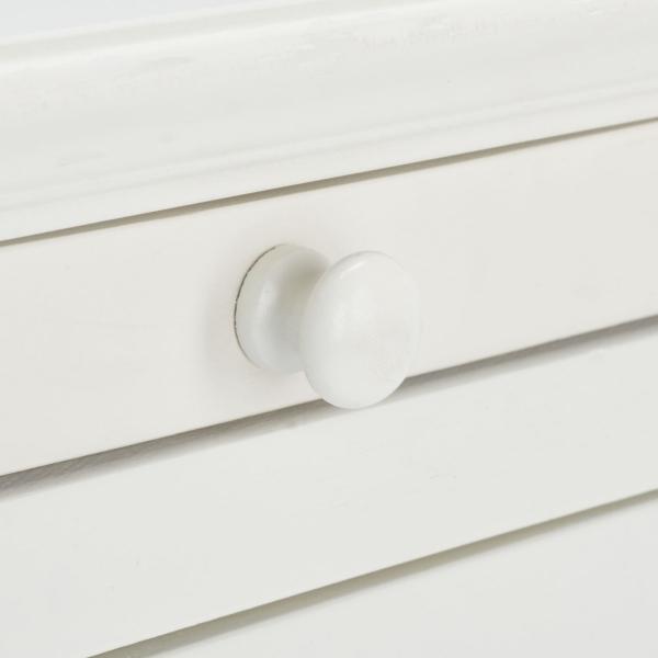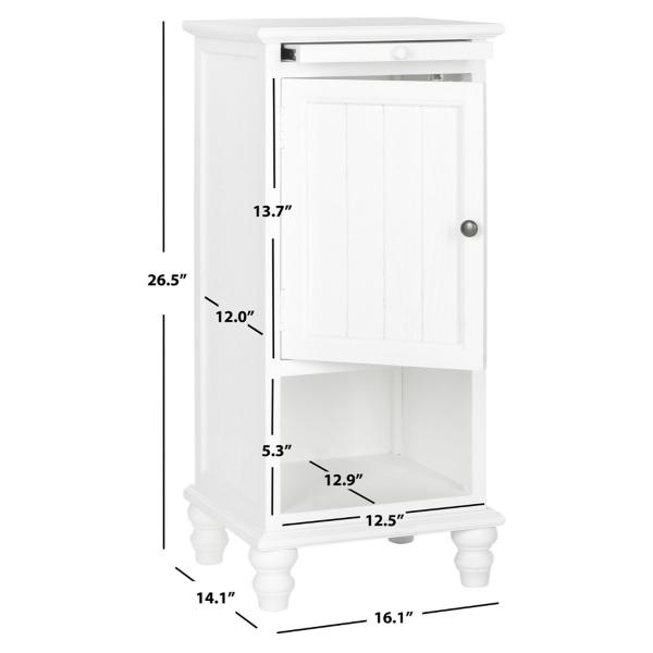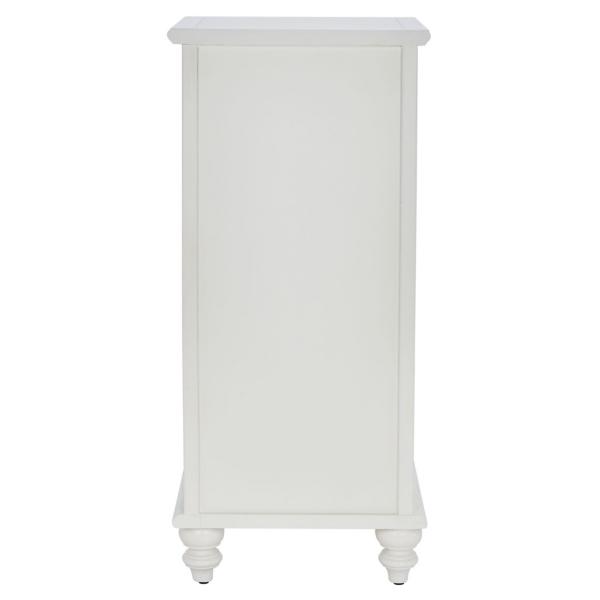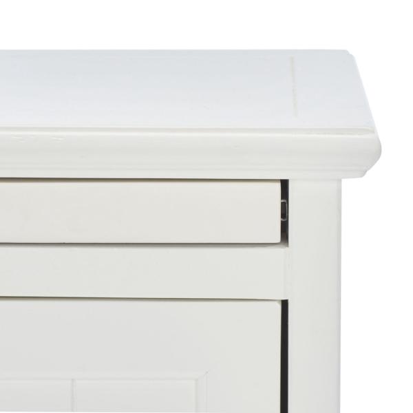 The White Wood Bead Board Daya End Table evokes Early American style with its bead board-inspired cabinet door, pullout shelf, and turned bun feet. Constructed of white poplar wood, its roomy cabinet and lower storage space makes organization a breeze! End table measures 16.1W x 14.2D x 36H in. Crafted of wood White finish Features one (1) pull-out tray, one (1) cabinet, and one (1) open lower shelf Bead board design Cabinet measures 12.5W x 12D x 13.7H in. Open shelf measures 12.5W x 12.9D x 5.3H in. Weight: 17.6 lbs. Weight capacity: 45 lbs. assembly required Not intended for commercial use Care: Wipe with a soft, dry cloth. This item is available at Kirklands.com only, not available in stores. Please note: this item cannot be shipped to APO/FPO addresses.