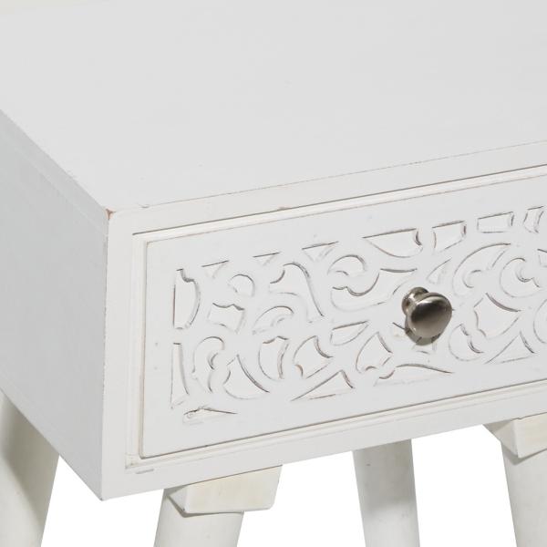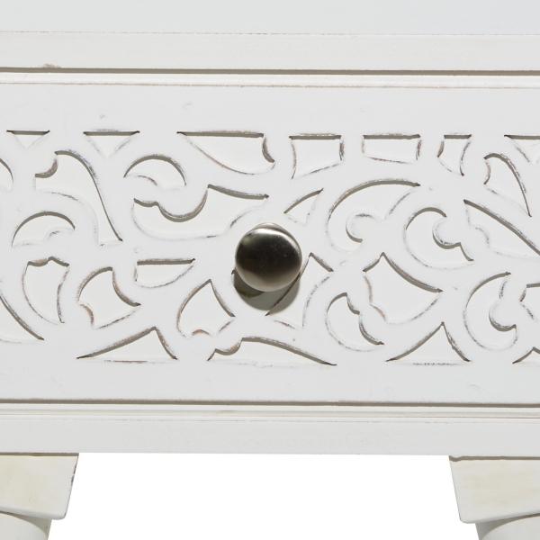 Update any farmhouse or boho setting with this White Wood Carved Drawer Accent Table. The intricate, scroll carved design will add an elegant touch to your décor. Table measures 16L x 13W x 24H in. Crafted of mango wood and wood composite White finish Scroll carved drawer front design Features one (1) drawer with silver knob Tapered legs Weight capacity: 100 lbs. No assembly required Not intended for commercial use Care: Dust with a soft, dry cloth. This item is available at Kirklands.com only, not available in stores. Please note: this item cannot be shipped to APO/FPO addresses. WARNING: Cancer and Reproductive Harm - For more information go to www.P65Warnings.ca.gov.
