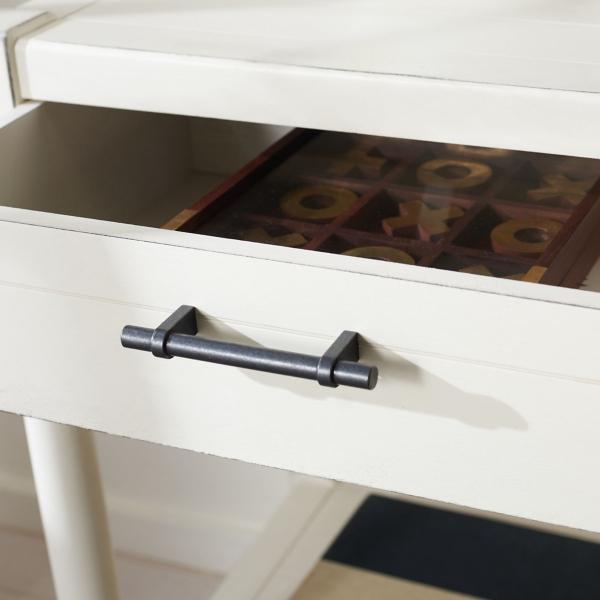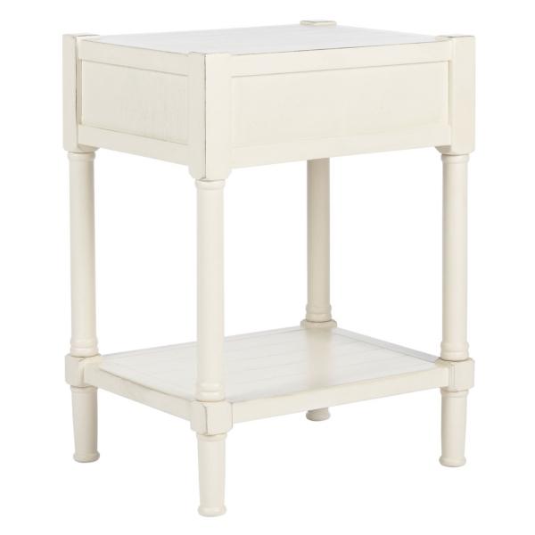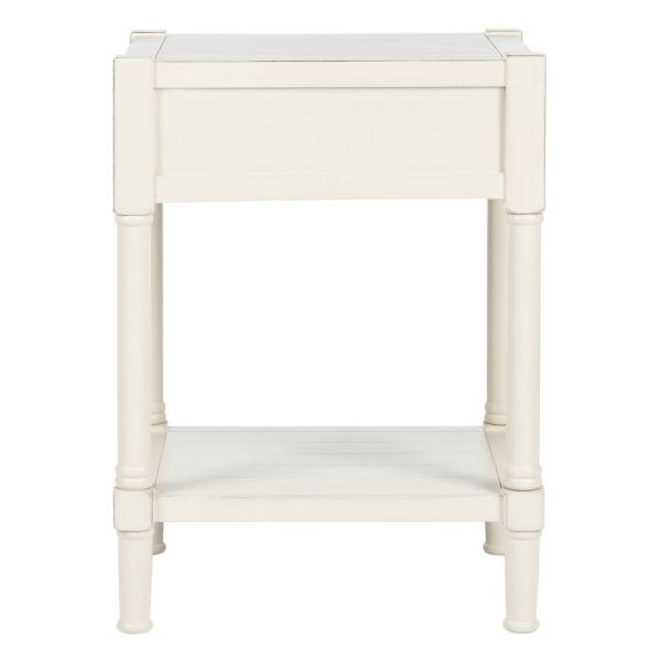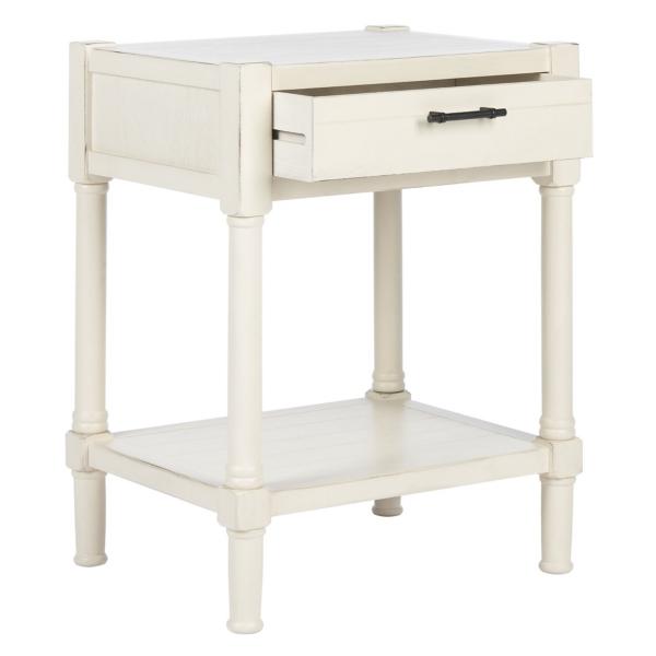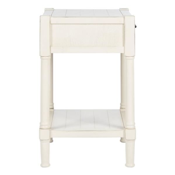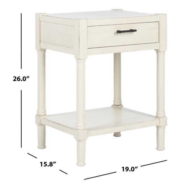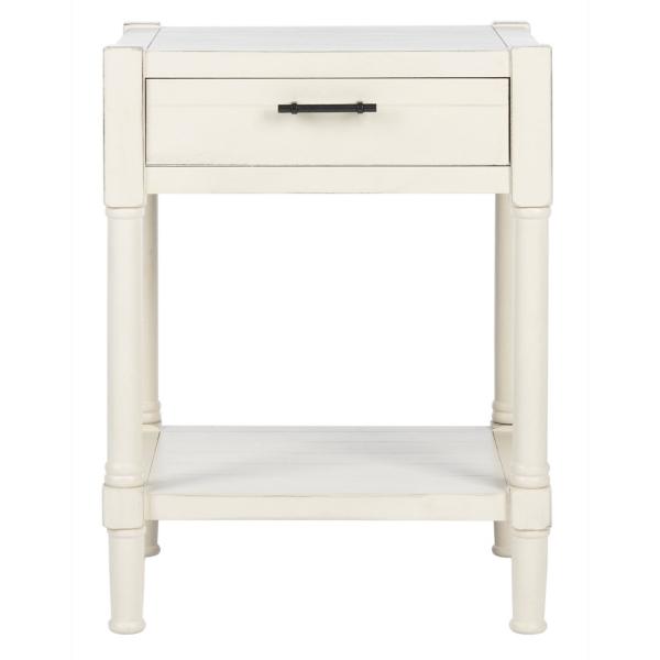 Modern minimalism meets traditional elegance with this White Wood Finley 1-Drawer End Table! Its distressed white finish ensures this table seamlessly blends with any décor. End table measures 22W x 15.8D x 22.8H in. Crafted of pine wood and MDF Distressed white finish Features one (1) drawer and one (1) lower shelf Accented with turned legs Antique black metal drawer pull Drawer measures 14.4W x 9.8D x 3.6H in. Shelf measures 15.4W x 12.2D x 12.4H in. Weight: 17.6 lbs. Weight capacity: 40 lbs. Assembly required; see Info & Guides in the drop down below to view or print assembly info Not intended for commercial use Care: Wipe with a soft, dry cloth. This item is available at Kirklands.com only, not available in stores. Please note: this item cannot be shipped to APO/FPO addresses.