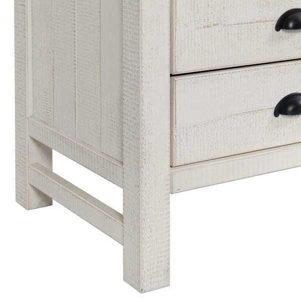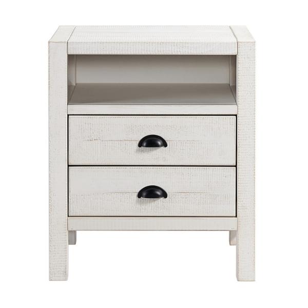 The modern farmhouse design of this White Wood Open Shelf Nightstand will go seamlessly with any decor. With its drawers and shelf space, it's the perfect thing to have beside your bed. Its compact storage space makes it ideal for smaller rooms! Nightstand measures 17L x 22W x 25H in. Crafted of wood White finish Features one (1) open shelf and two (2) drawers Black metal drawer pulls Weight capacity: 80 lbs. Assembly required Not intended for commercial use Care: Dust with a soft, dry cloth. This item is available at Kirklands.com only, not available in stores. Please note: this item cannot be shipped to APO/FPO addresses.