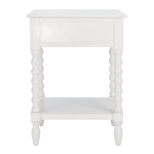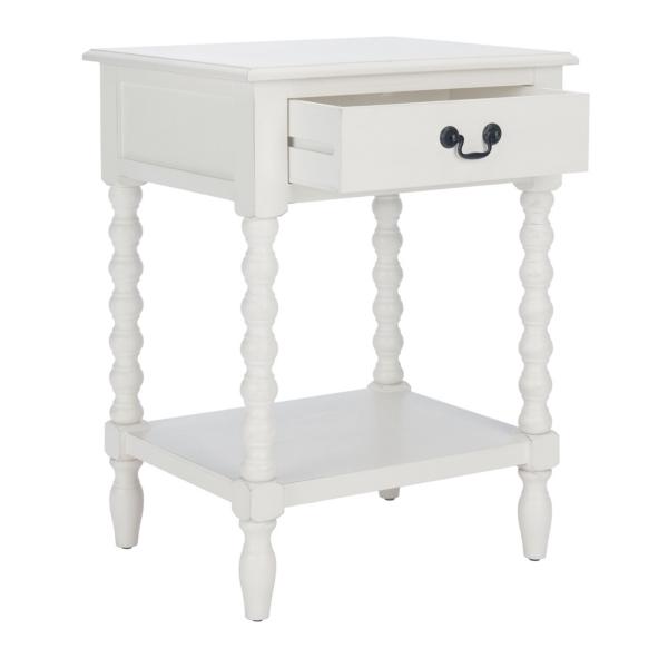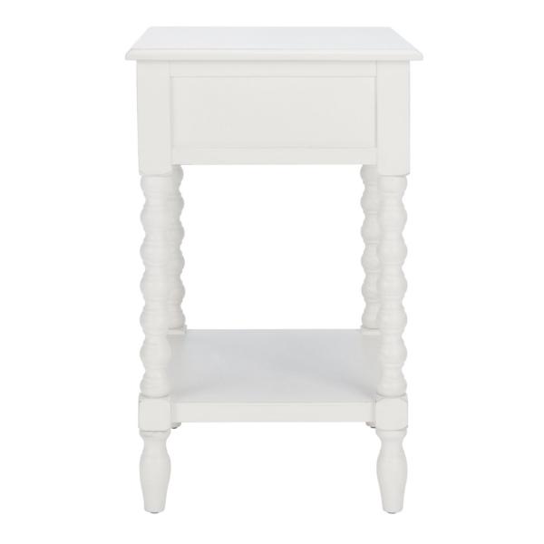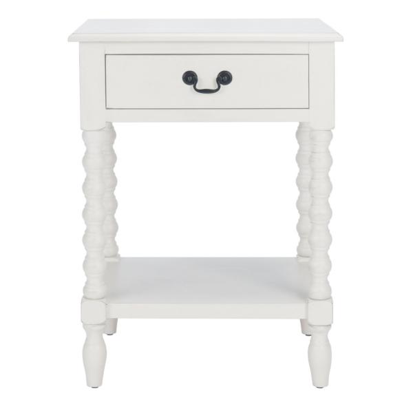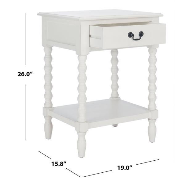 Classic farmhouse charm meets contemporary style in this White Wood Phoebe End Table! This table's modernized ball-turned legs are beautifully highlighted by its distressed white finish, while an open bottom shelf and slim drawer provide ample storage and display space. Table measures 19W x 15.8D x 26H in. Crafted of pine wood and MDF White finish Features one (1) drawer and one (1) lower shelf Ball-turned legs Black drawer pull finish Drawer measures 12.5W x 9D x 3.5H in. Shelf measures 14.3W x 11.2D x 12.5H in. Weight: 17.6 lbs. Weight capacity: 40 lbs. Assembly required; see Info & Guides in the drop down below to view or print assembly info Not intended for commercial use Care: Wipe with a soft, dry cloth. This item is available at Kirklands.com only, not available in stores. Please note: this item cannot be shipped to APO/FPO addresses.