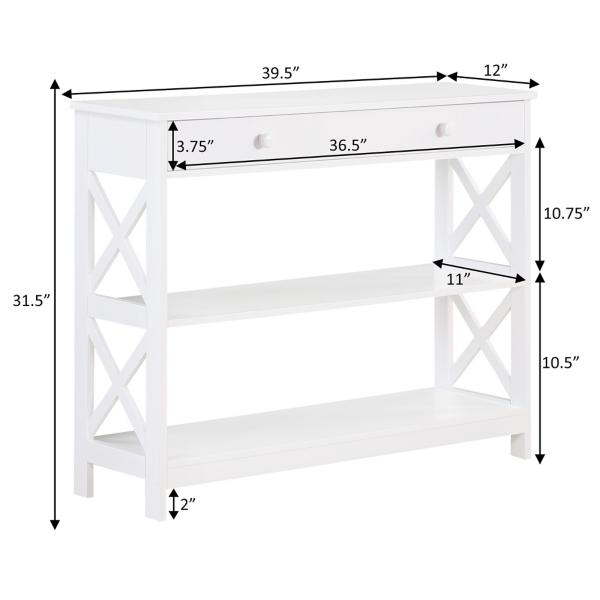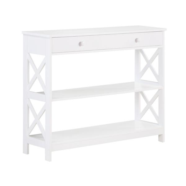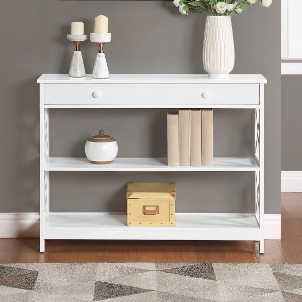 The modern, angular design of this White X-Frame 2-Shelf Console Table will give your space a fresh update. Featuring clean lines and plenty room for display and storage, it will perfectly complete any room! Table measures 39.5L x 12W x 31.5H in. Crafted of wood composite Painted white finish Features two (2) drawers and two (2) shelves Decorative X side design Weight: 42 lbs. Shelf weight capacity: 20 lbs. Assembly required Not intended for commercial use Care: Dust with a soft, dry cloth. This item is available at Kirklands.com only, not available in stores. Please note: this item cannot be shipped to APO/FPO addresses.