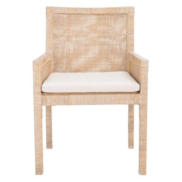 This Whitewash Cane and Mango Wood Rayan Accent Chair is the perfect stylish and functional addition to your space. Its contemporary coastal design is sure to refresh your home. Chair measures 22.8W x 22.4D x 34.6H in.; seat height: 17.32 in. Crafted with a mango wood frame Upholstered in fabric and filled with high-density foam Whitewash wood finish White upholstery finish Features a natural cane frame Weight capacity: 275 lbs. No assembly required Not intended for commercial use Care: Spot clean. This item is available at Kirklands.com only, not available in stores. Please note: this item cannot be shipped to APO/FPO addresses.