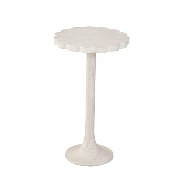 This Whitewashed Wood Scalloped Kylee Accent Table has a charming, farmhouse-inspired design! This compact accent table is perfect for keeping essentials, like your drink, book, or remote, close by without sacrificing space. Accent table measures 21H x 12 in. in diameter Crafted of mango wood Whitewash finish Round shape with scalloped edges Tulip base design Weight: 5 lbs. No assembly required Not intended for commercial use Care: Wipe with a soft, dry cloth. This item is available at Kirklands.com only, not available in stores. Please note: this item cannot be shipped to APO/FPO addresses.