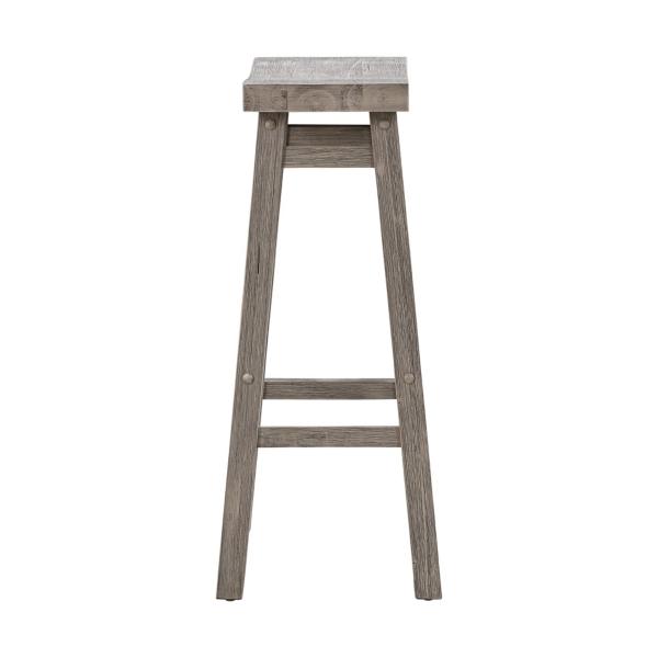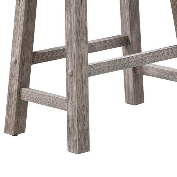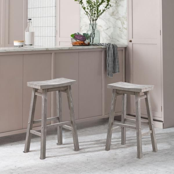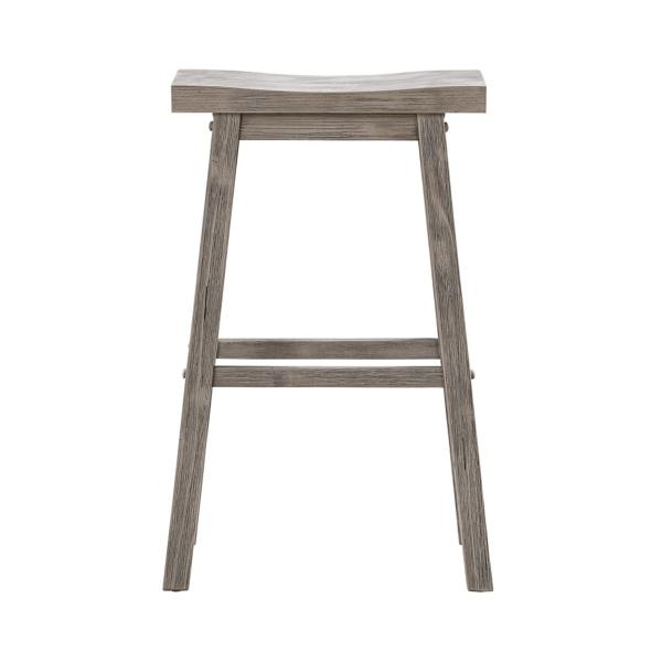 Our Wire Brushed Gray Saddle Wood Bar Stool will bring a rustic flair to your dining space. Its contoured saddle seat will keep you comfortable all meal long. You'll love how its rustic gray finish looks in any space! Stool measures 17.75L x 10W x 29.25H in.; Seat height measures 29H in. Crafted of rubberwood Wire-brushed gray finish Rectangular stool design Features built in footrests Weight: 13 lbs. Assembly required Weight capacity for each chair: 250 lbs. Not intended for commercial use Care: Wipe clean with a damp cloth. Please use a coaster or mat if placing hot or wet food/drinks on item to limit any potential damages. This item is available at Kirklands.com only, not available in stores. Please note: this item cannot be shipped to APO/FPO addresses. WARNING: This product can expose you to chemicals including sawdust which is known to the state of California to cause cancer and birth defects or other reproductive harm. For more information go to www.P65Warnings.ca.gov.