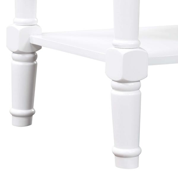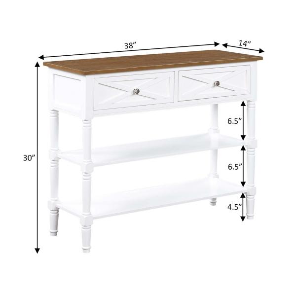 Elevate your entryway with this Wood & White Traditional Console Table! This farmhouse-style console table features a two-tone finish with rustic-inspired details. You'll love the ample storage space, from the shelves to the drawers! Console table measures 38W x 14D x 30H in. Crafted of solid wood, manufactured wood, veneer, and finished with non-lead-based paint Light brown tabletop wood finish White base finish Features two (2) drawers and two (2) lower shelves Turned leg design X-design door fronts Nickel hardware finish Weight: 42 lbs. Weight capacity: 60 lbs. Assembly required Not intended for commercial use Care: Dust with a soft, dry cloth. This item is available at Kirklands.com only, not available in stores. Please note: this item cannot be shipped to APO/FPO addresses.
